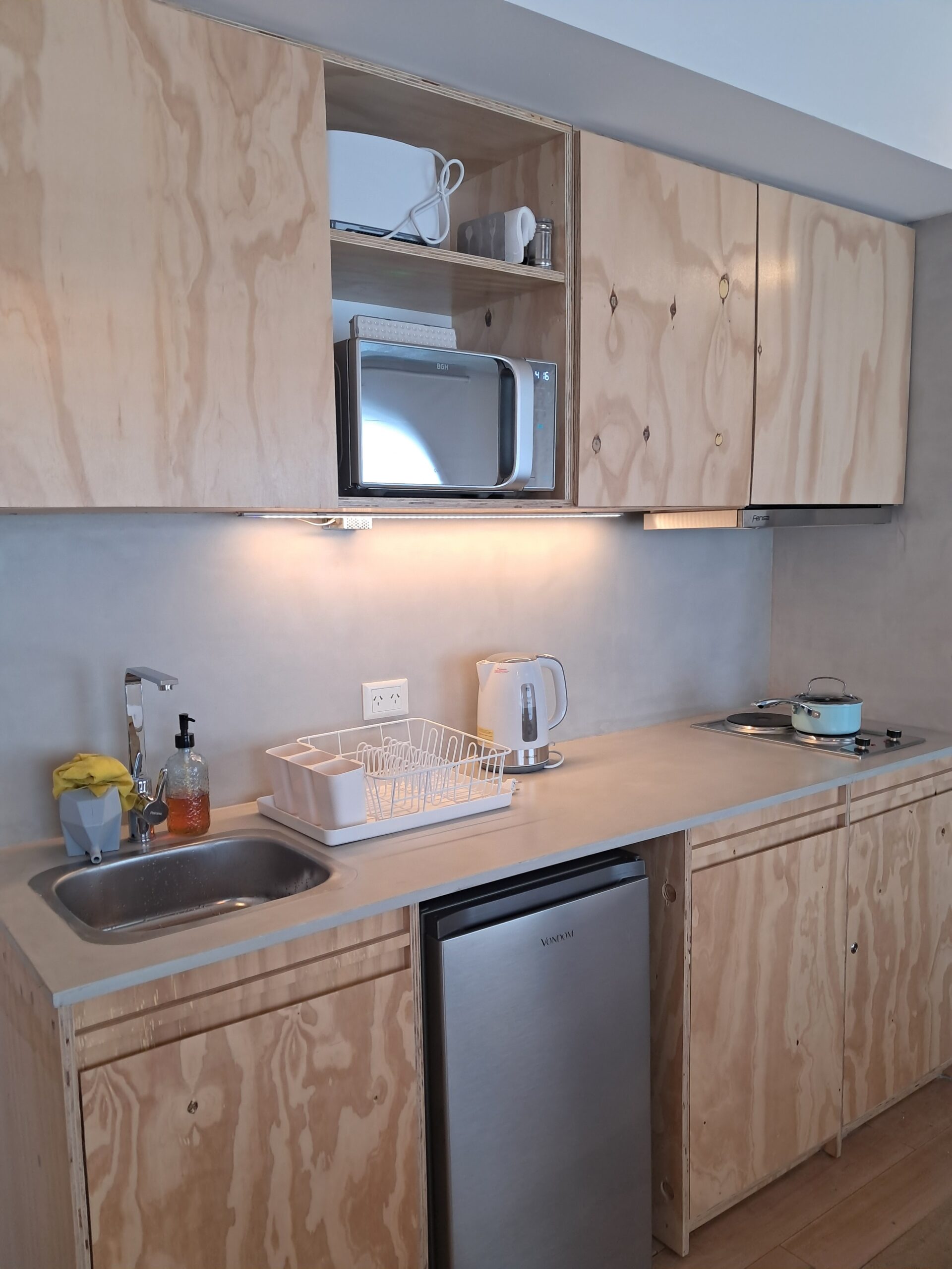 Frigobar, microondas y anafe eléctrico para preparar comidas simples.